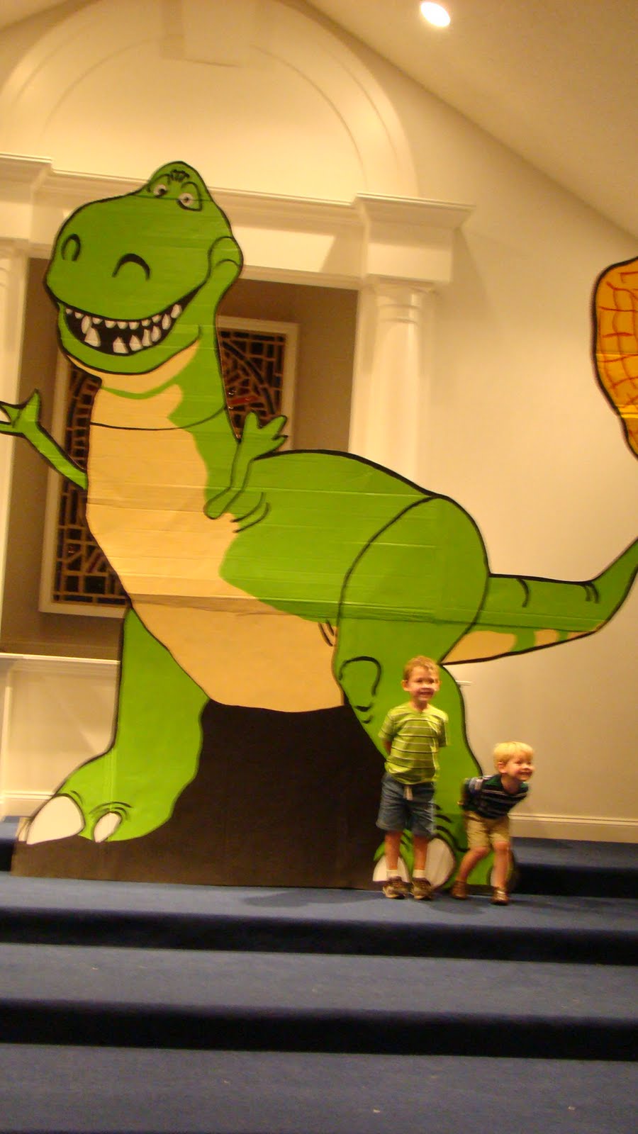 I really wish you all could have been there for our kick off day the Sunday before we began. Every year our staff does some kind of skit to get the kids pumped up for VBS and this year was so funny. Our youth pastor drew and painted these HUGE cardboard cuts of the characters on the stage and they were just awesome, God blessed him with the talent to draw. Well our pastor dressed up as Woody and it was funny to see a like 6’3 man dressed like a little cowboy! Our children’s pastor who came up with our theme and wrote the materials dressed up as Buzz, man that was some funny stuff. He showed the church that he was so mad dance skillsJ. Then our youth minister was Zurg and he made his costume himself and did a great job. Their skit was so funny and cute, I guess since it is men that were in it I should say it was umm funny that’s it funny.